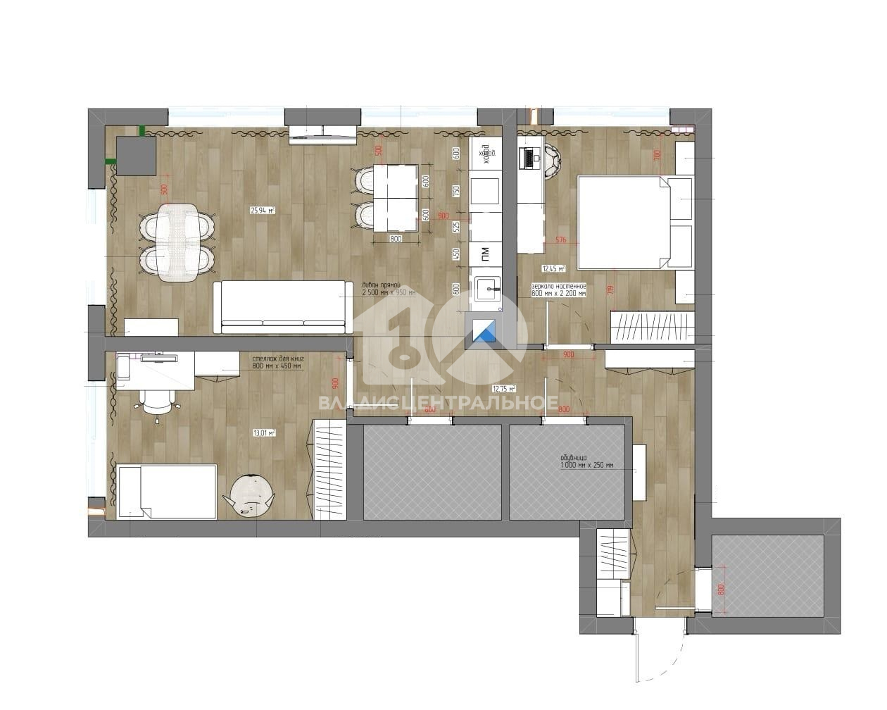 Планировка 75 кв м включает две изолированные комнаты и просторную кухню-гостинную, две ванные комнаты, прачечную, выходы на французский балкон из каждого окна (всего 4), что добавляет комфорта и возможности для организации жилого и рабочего пространства.