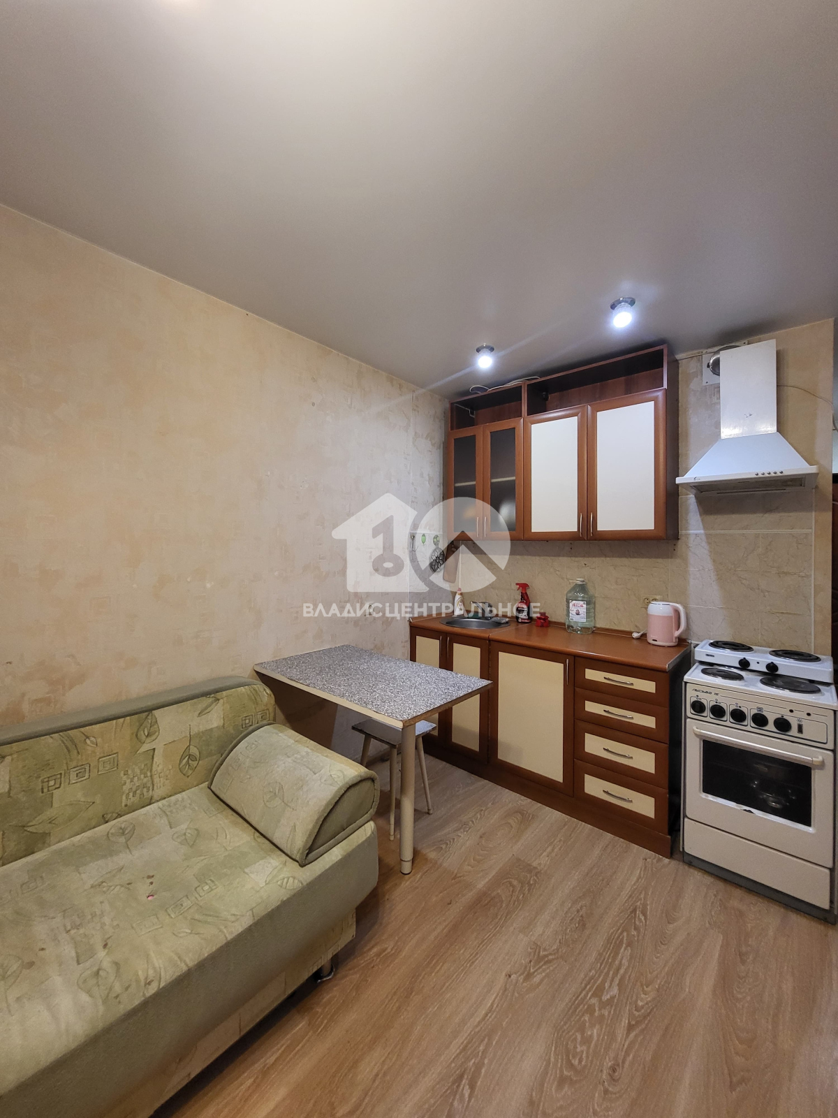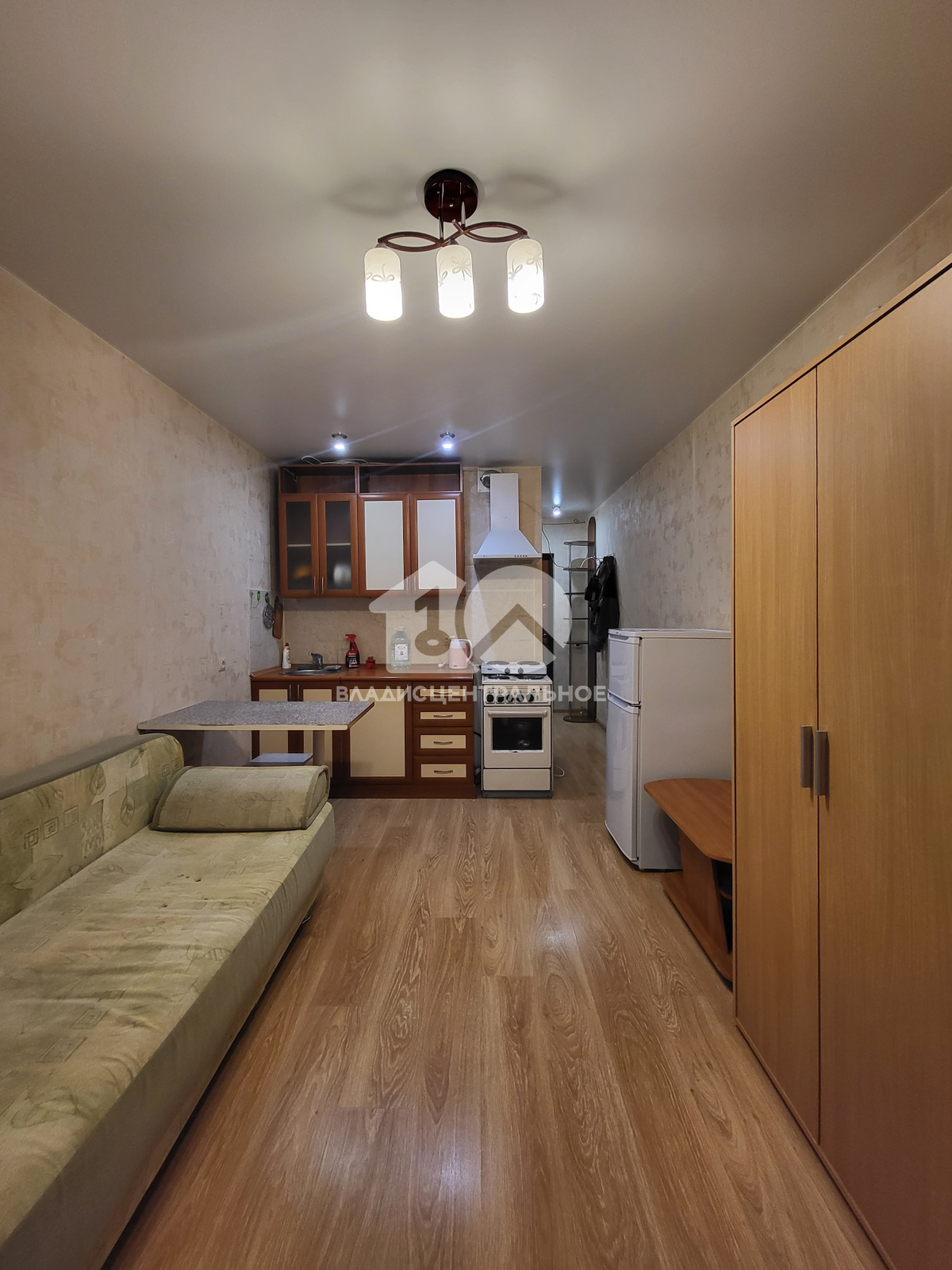 Квартира полностью меблирована: диван-кровать, который легко трансформируется, вместительный шкаф для хранения вещей и кухня с техникой.