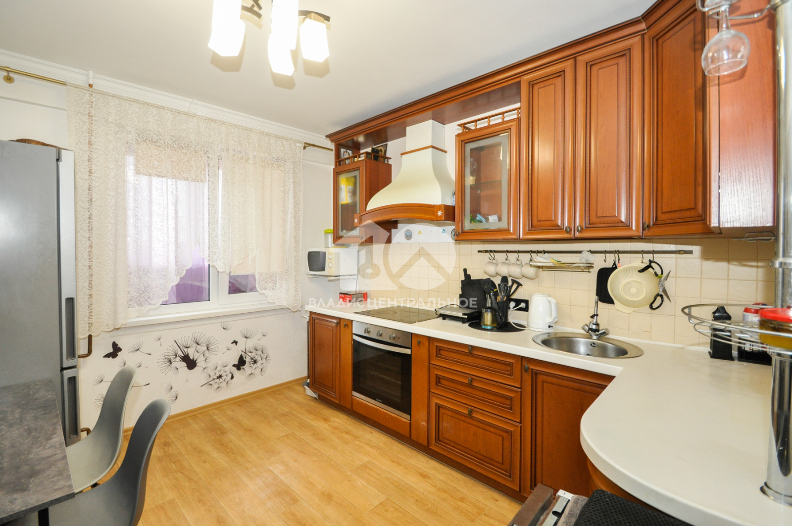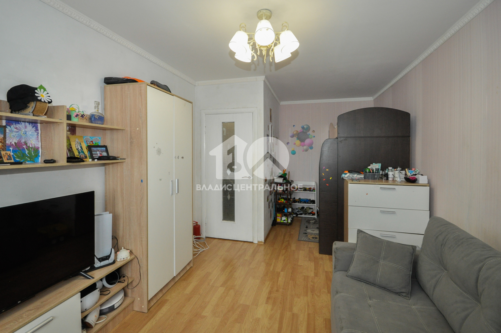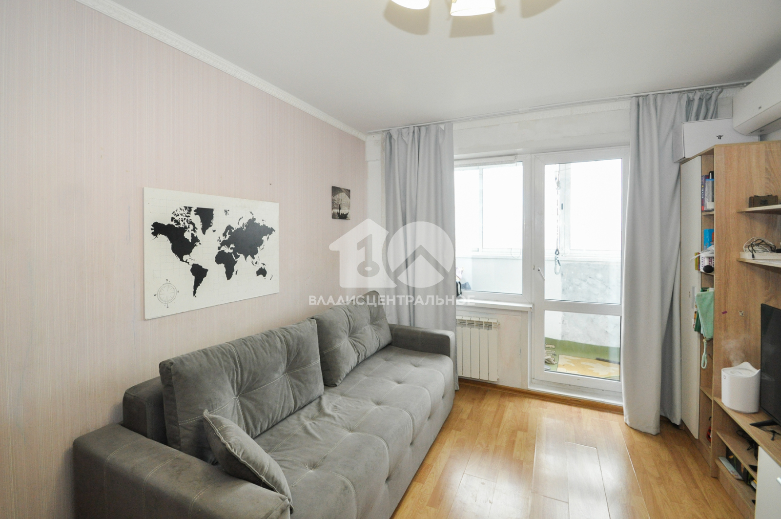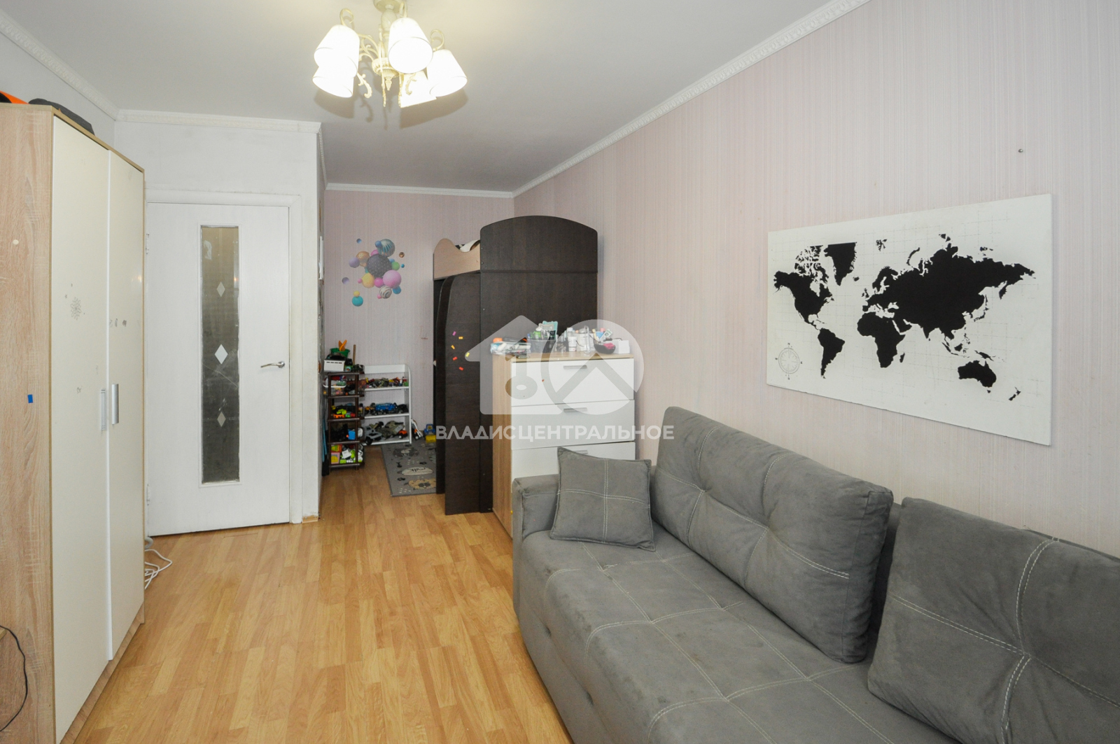 На стенах наклеены обои, на полу ламинат. балкон остеклен, вытянутые потолки.