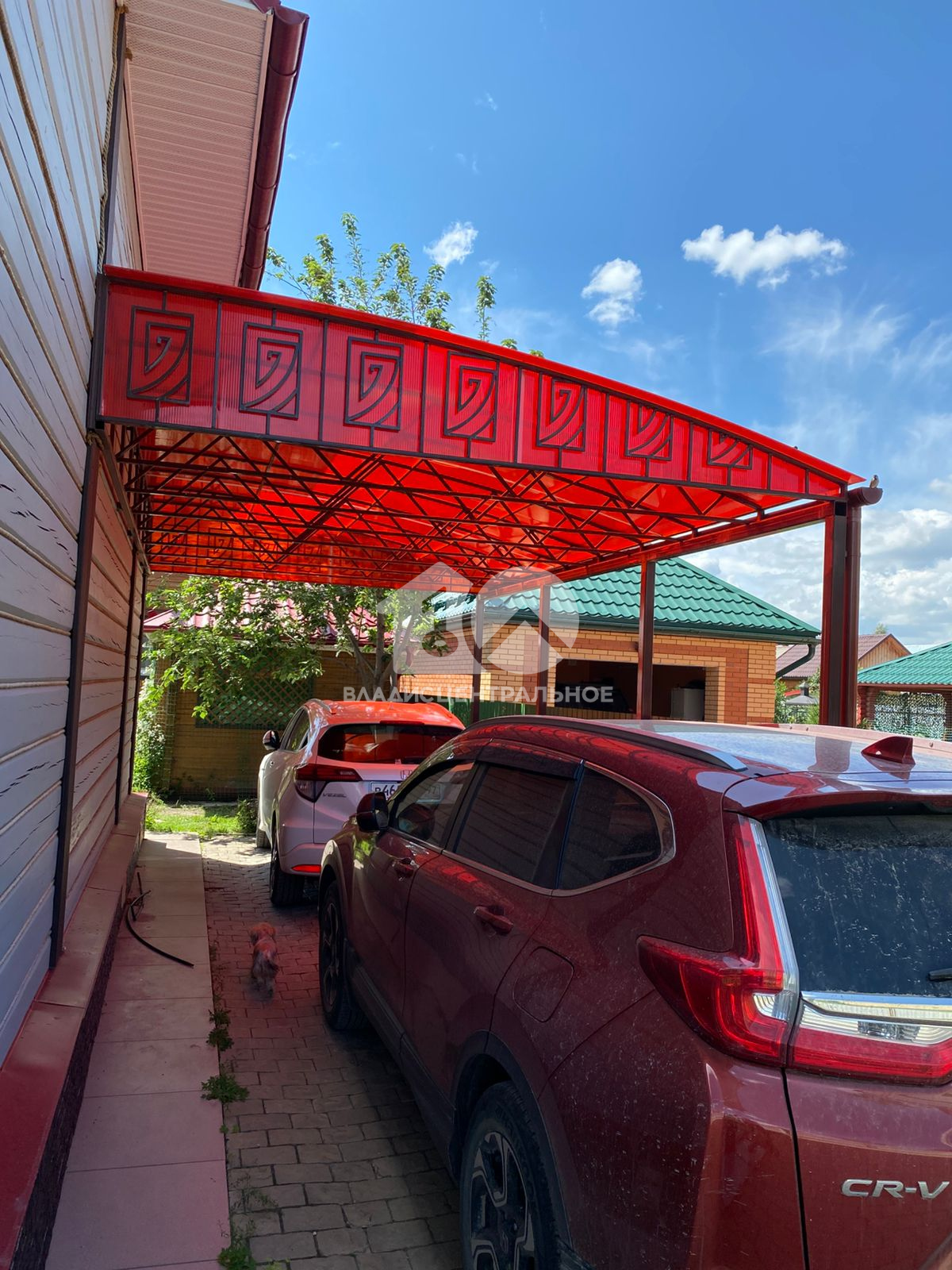 Парковка на два автомобиля, под крышей. Дорожки, парковка из брусчатки.