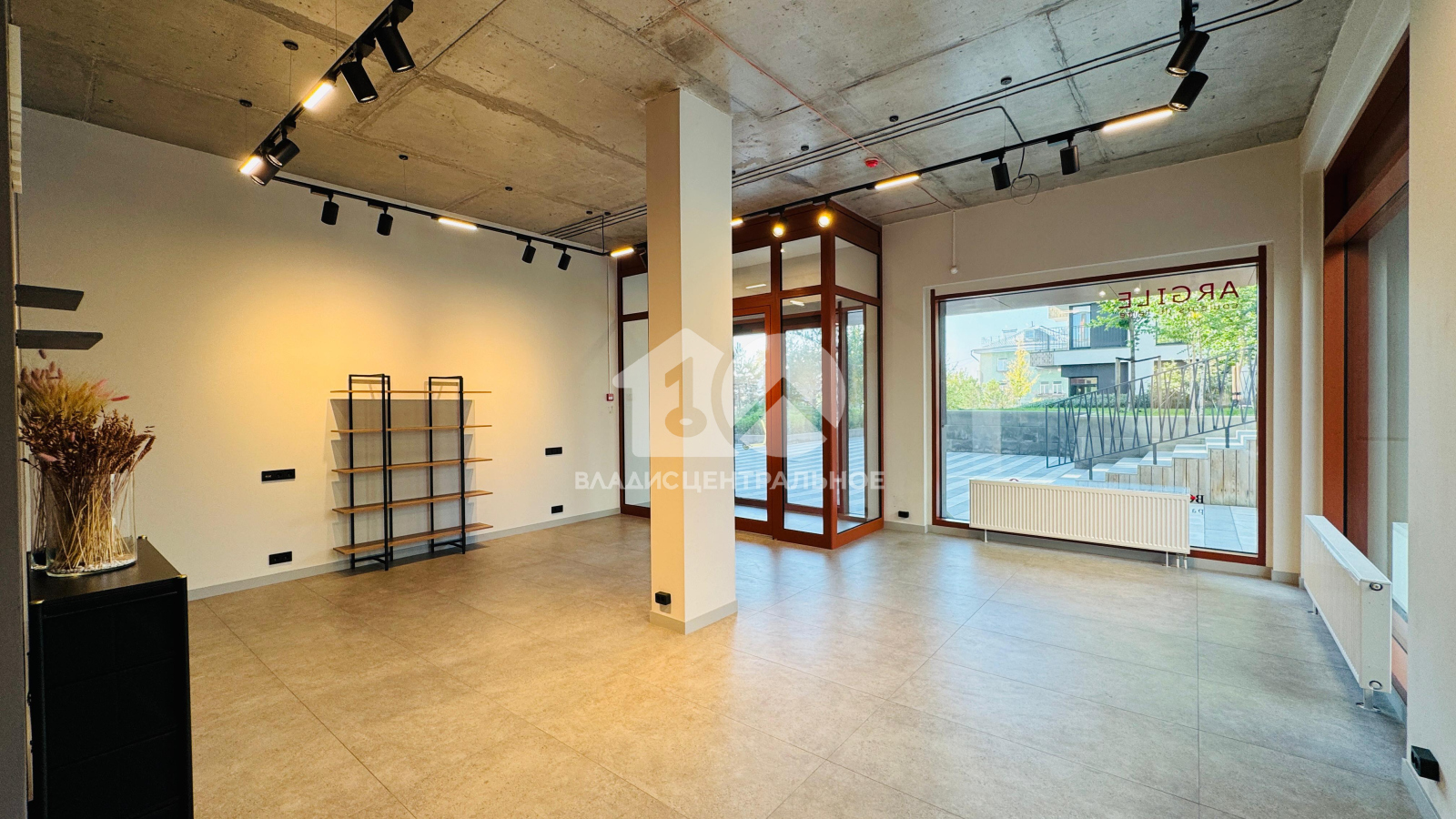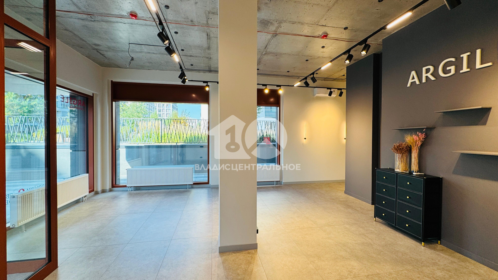Панорамные окна и высокие потолки.