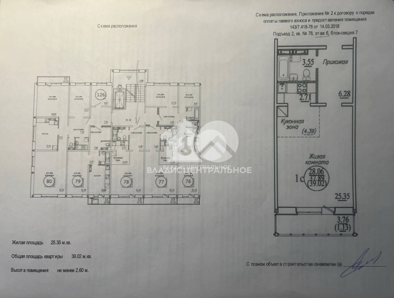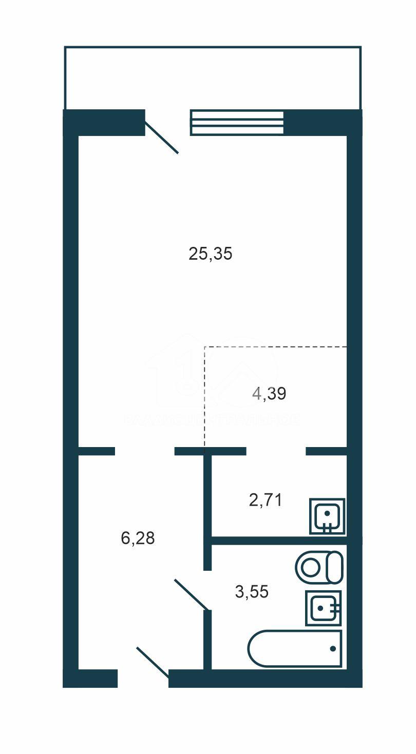 Студия расположена на 6 этаже 10-этажного панельного дома. Общая площадь — 39,02 кв. м, жилая — 25,4 кв. м, площадь кухни — 4,4 кв. м. Окна выходят на улицу. В квартире один совмещённый санузел.