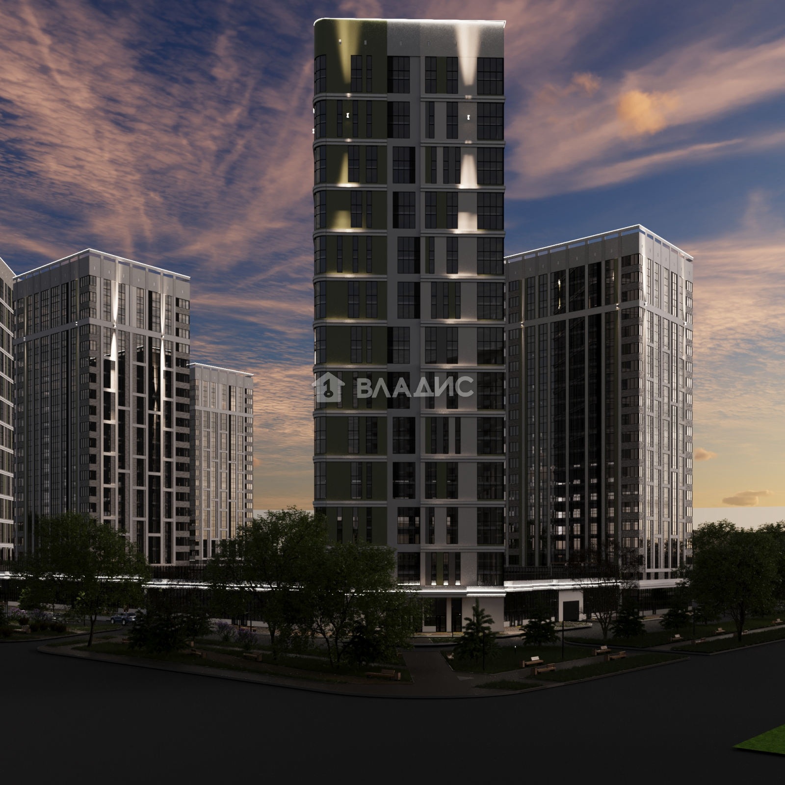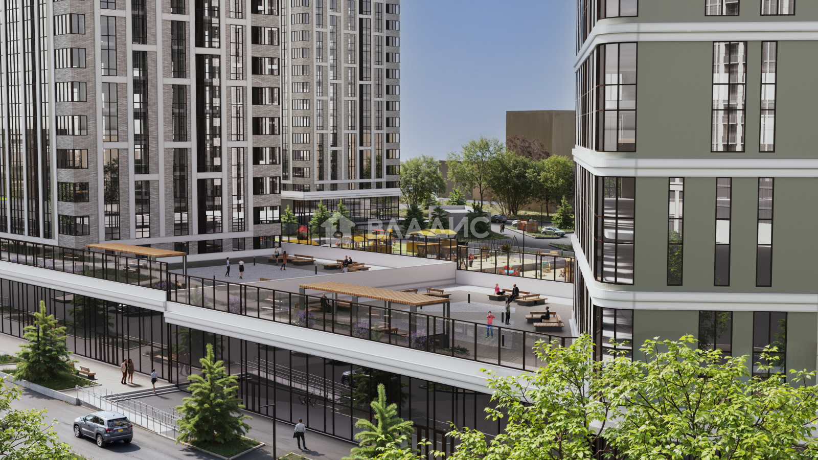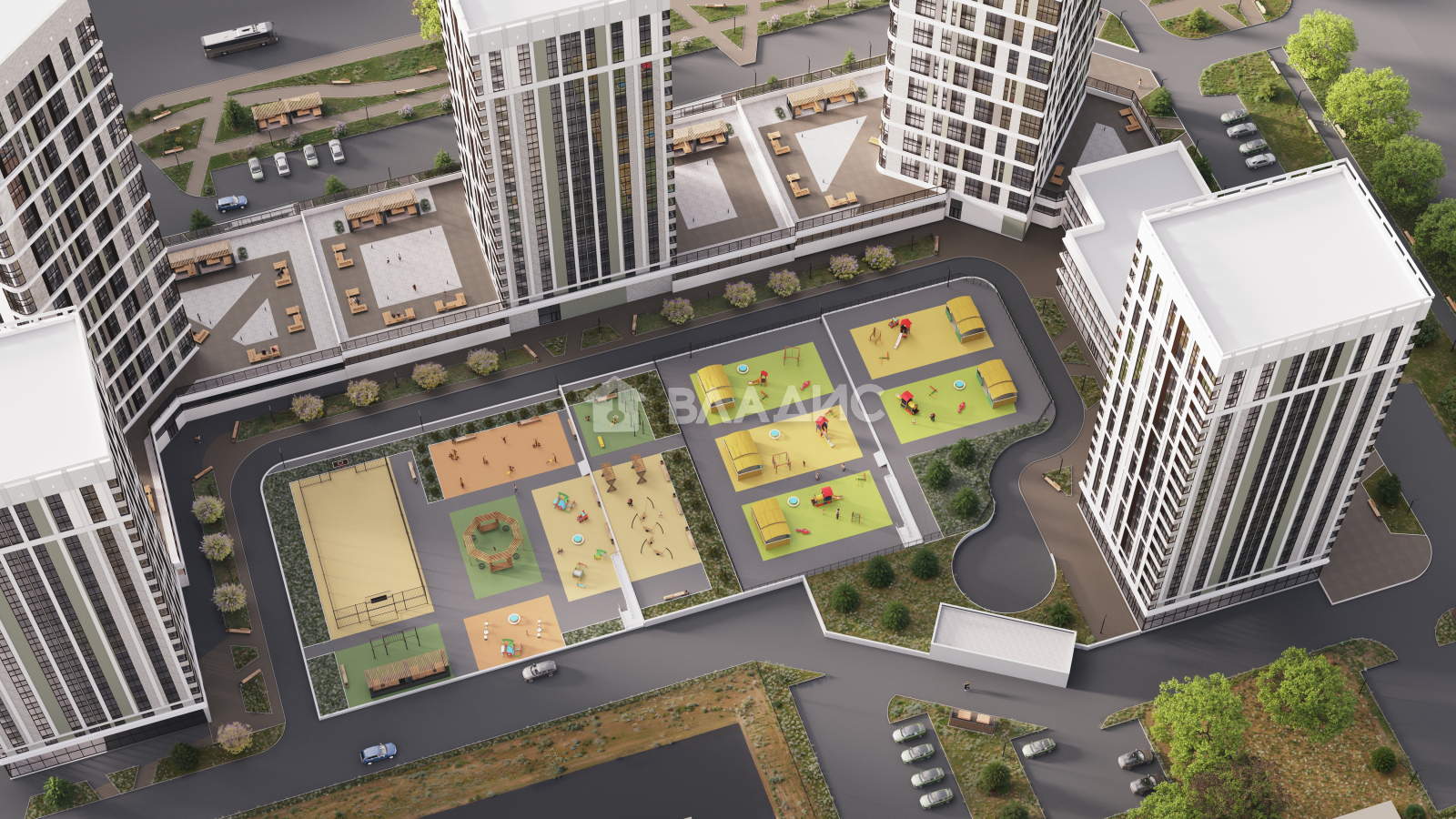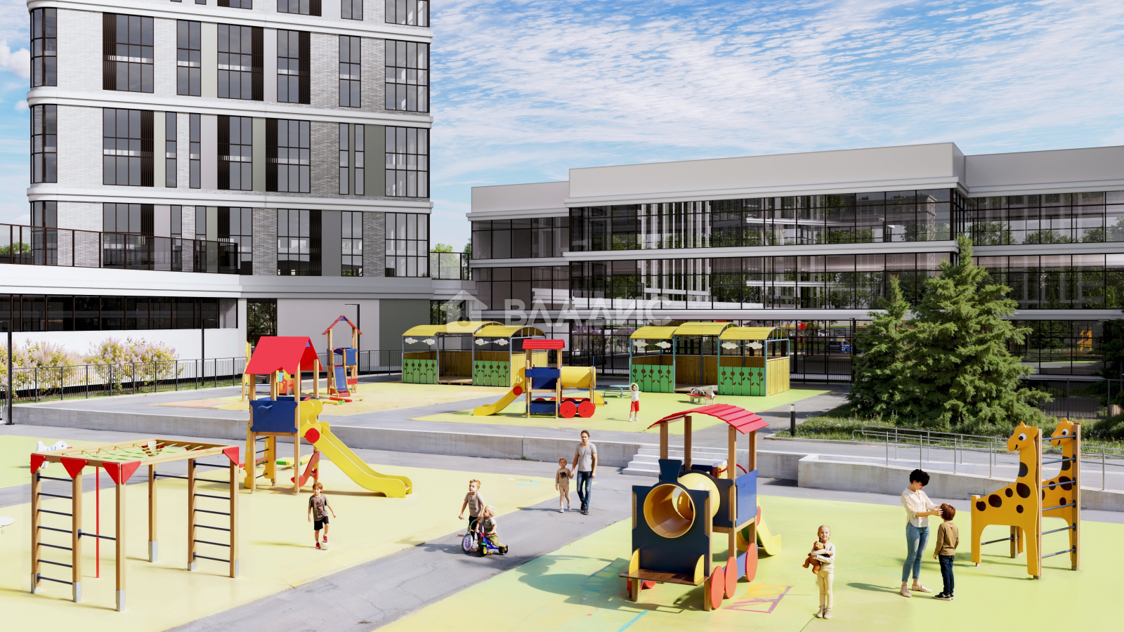 На территории жилого комплекса предусмотрен собственный детский сад, зоны для отдыха, детские площадки и зеленые скверы.