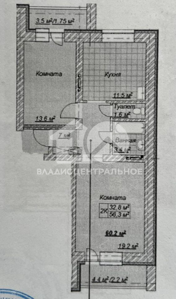 Общая площадь квартиры составляет 60,2 кв. м, из которых 32,8 кв. м — жилая площадь. Две изолированные комнаты (19,2 кв. м и 13,6 кв. м) обеспечивают комфорт и уединение. Просторная кухня площадью 11,5 кв. м идеально подходит для приготовления любимых блюд и семейных ужинов.
