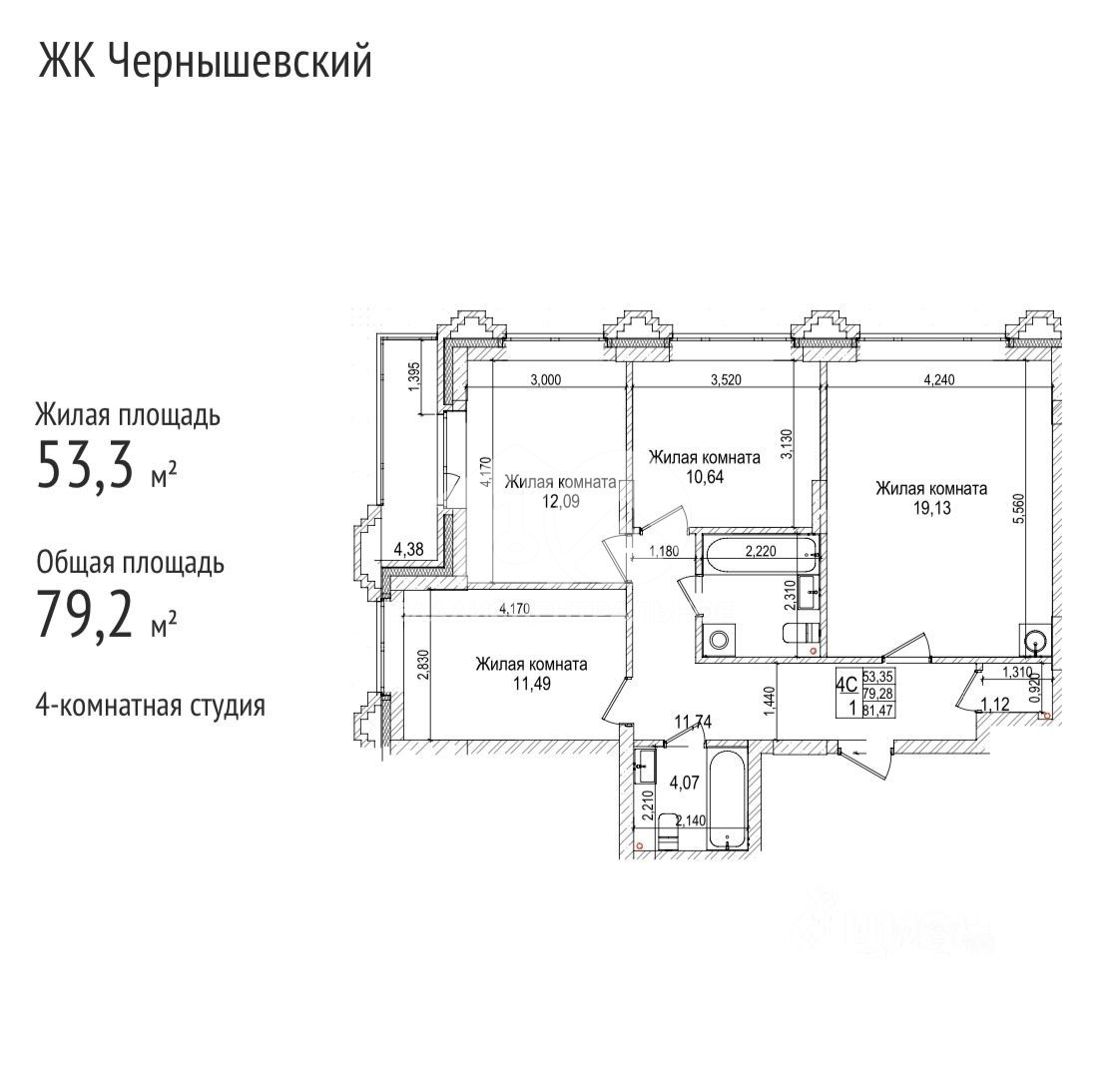 Общая площадь квартиры составляет 79 квадратных метров, из которых 53 приходятся на жилую площадь. Просторная кухня площадью 19 квадратных метров станет отличным местом для семейных ужинов и дружеских посиделок. Дизайнерский ремонт создаёт уютную атмосферу и подчёркивает стиль квартиры. Окна выходят на улицу, открывая живописные виды и наполняя помещения естественным светом.