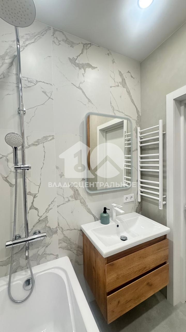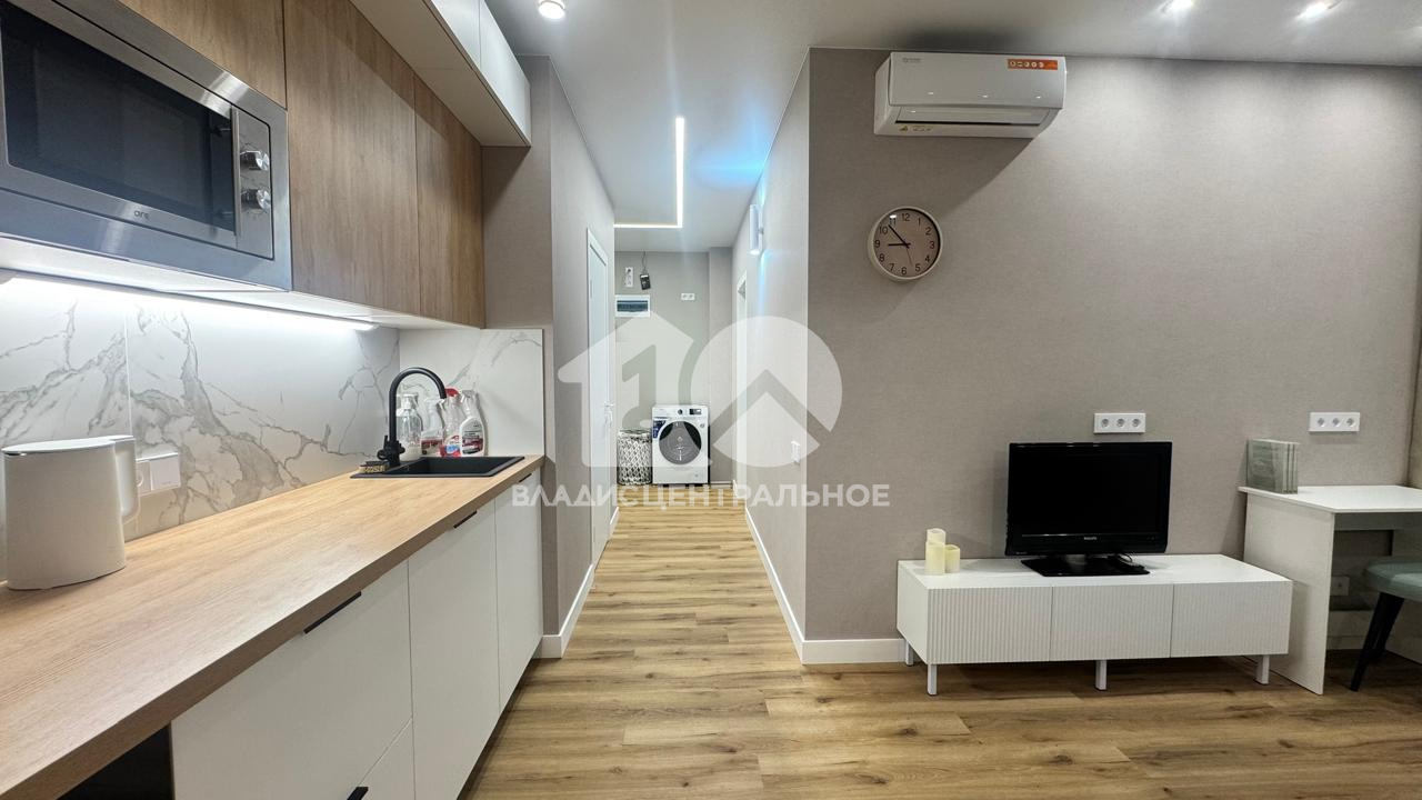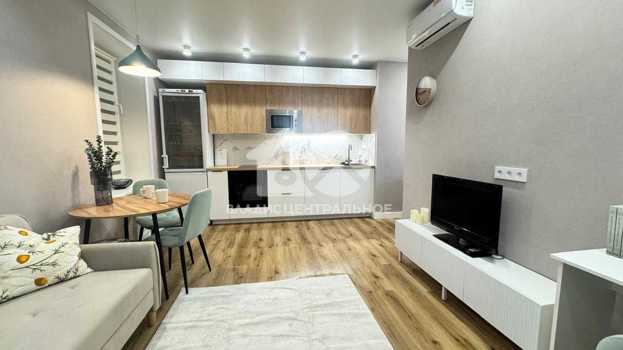 Ремонт выполнен для себя, никто не жил. Потолок натяжной с зонированным освещением, подвесами и проводными выключателями, на полу кварцвиниловая плитка, качественные обои, в санузле керамогранит( ванна, унитаз с инсталляцией, гигиенический душ, бойлер), установлен кондиционер (с выводом трассы в канализацию). Квартира меблирована, кухонный гарнитур останется новым собственникам, остальная мебель обсуждается.