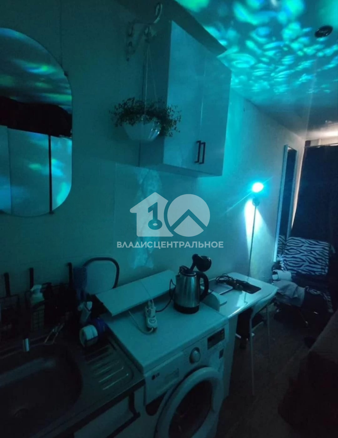 В подарок будущему владельцу остаётся большой вместительный шкаф (хватит для размещения на 2 взрослых человек), стол (можно убрать ножку и в сборном состоянии стола в комнате будет ещё больше места), тумба с раковиной, напольная тумба, навесной шкаф, кухонный гарнитур, полка для микроволновки и холодильник, гардина со шторами (блэкаут).
